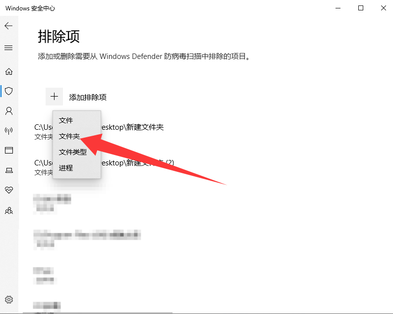 进入到添加排除项的视窗页面中,→ 选择【添加排除项】→ 点击【文件夹】。